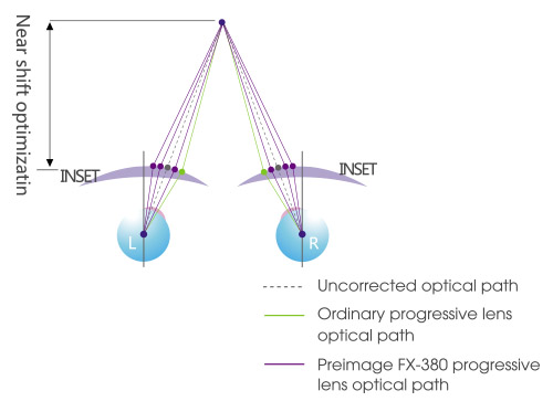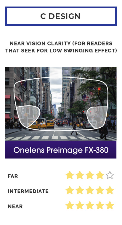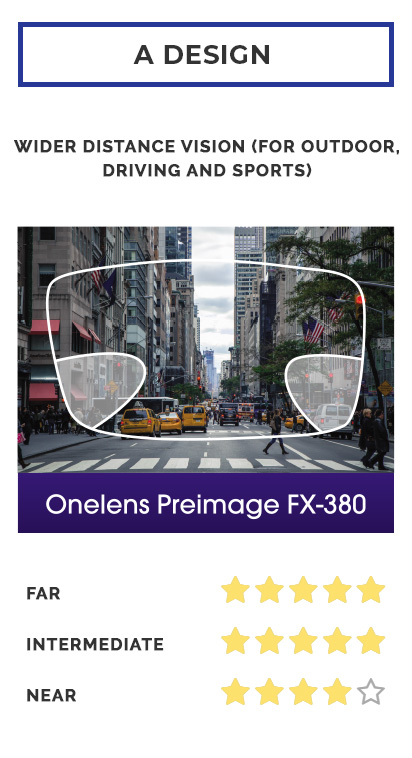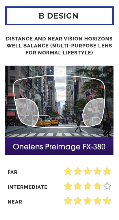 Fully Customized Progressive LensOnelens Preimage FX-380 is a high precision computerized freeform design that incorporate "All-Round 360 degree vision". The customized advanced optical lens not only eliminate blind spots but also optimize the wearer vision acuity experience.